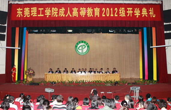 3月18日,我校成人高等教育2012级新生开学典礼在莞城校区大礼堂举行。学校党委书记周致纳、校长杨晓西、副书记吕琦元,东莞市教育局副局长黄金海,成人教育教学指导小组成员、成教学院负责人以及1300余名新生等参加了开学典礼。