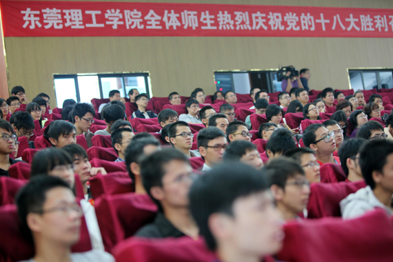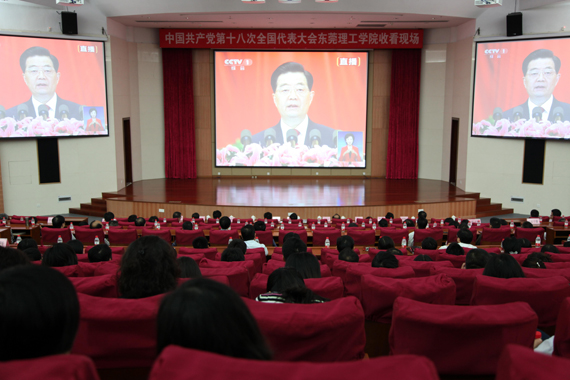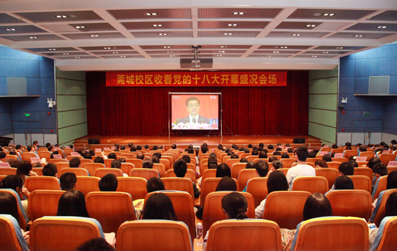 上午9时,学校领导成洪波、杨晓西、吕琦元、安少华、邹晓平、戴炳源、李忠红,校党委委员李培经、邢大立、杨敏林以及师生代表约400人在会议中心报告厅集中收看了中央电视台现场直播的党的十八大开幕盛况,认真聆听了胡锦涛总书记代表十七届中央委员会所作的工作报告。同时,莞城校区也组织师生在莞城校区学术报告厅集中观看了开幕式。此外,许多师生也自发通过网络关注十八的召开。
