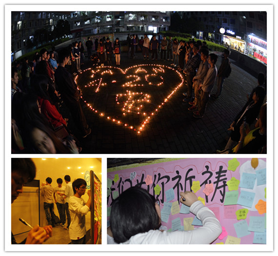 一圈蜡烛、一幅心愿墙,同学们以这种简单而虔诚的方式为雅安祈祷。不少途经的同学自发加入到祈祷队伍中,大家不约而同地把心形蜡烛围住,透过明亮的烛火,默默地为逝者哀悼,为生者祈福。