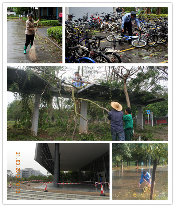 暴风雨过后,学校各院(系)立即发送紧急通知,通过飞信、QQ、微博等形式了解学生安全状况。保卫处、资产后勤管理处、后勤集团等部门相关负责人也迅速到校园各处查看校园受损情况,对安全隐患进行紧急处理和抢修,同时做好安全防范措施,避免发生意外;还组织员工连夜开展校园清扫工作。