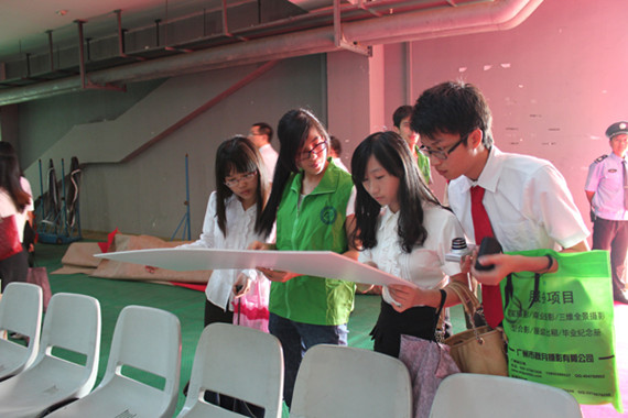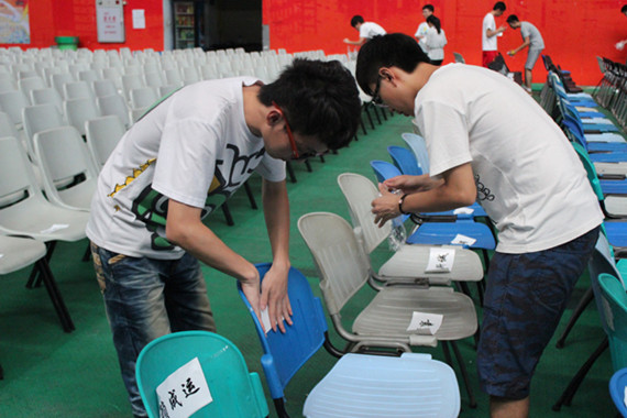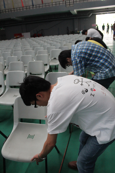 毕业典礼前夕,各校级组织、各院(系)团学组织以及校志愿服务中心的学生干部组成了一支志愿服务队,聚集在体育馆内为毕业典礼做好准备工作。炎炎夏日,志愿者们在体育馆内闷热的环境下布置场馆、摆放椅子、核对名单、在椅背上张贴毕业生名字……每项工作都做得认真细致。