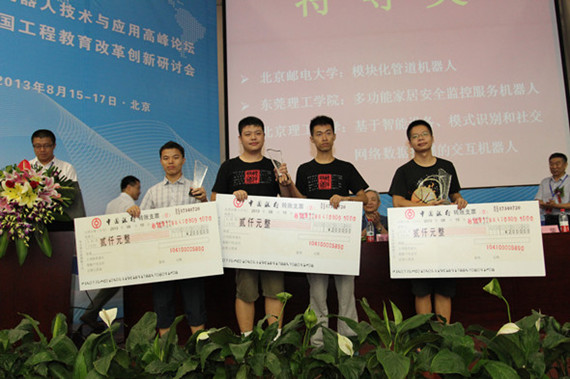 我校计算机学院派出三支队伍参加比赛,经过精心准备,努力拼搏,取得优异成绩,分别获得特等奖、二等奖和三等奖。其中,我校学生作品《多功能家居安全监控服务机器人》(队员:覃梓生、李浩建、李树茂、梁广平、赵子清;指导老师:黄培灿)获得特等奖;《消防机器人》(队员:苏剑悦、陈晓耿、张再响、吴妙灵;指导老师:洪小宇 )获得二等奖;《六足智能仿生机器人》(队员:吴金标、詹增煜、肖楚钊、吴侠志、李旭锐;指导老师:赵维佺)获得三等奖。