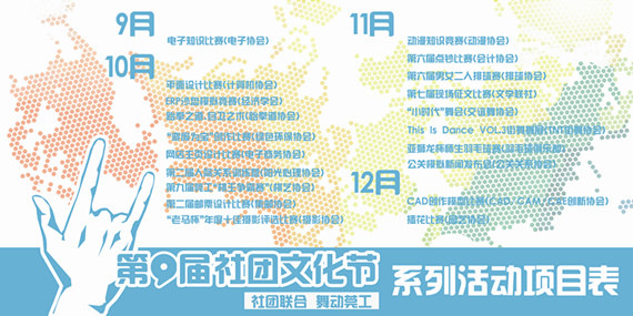 社团文化节是我校的品牌活动。据悉,本届社团文化节将持续到12月。期间还将举行一系列不同类型的文体竞赛和社团活动共20项,包括备受关注的职业规划大赛、校园十大歌手比赛等。