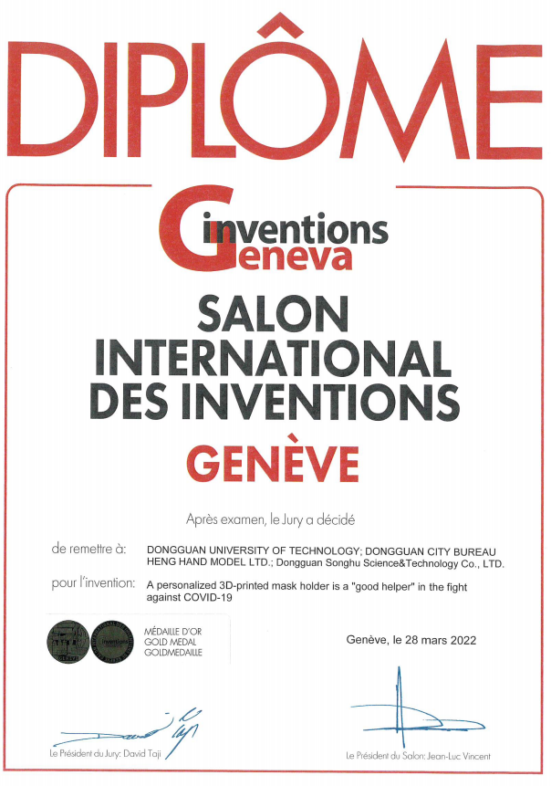 近日,第49届日内瓦国际发明展(International Exhibition of Inventions of Geneva)通过线上方式举办。科技创新研究院周梓荣教授、机械工程学院陈盛贵高工、教育学院(师范学院)李楠副教授等联合东莞市科恒手板模型有限公司、东莞市松湖科技有限公司完成的《抗击新冠疫情的“好帮手”——一种个性化3D打印口罩支架》项目获得金奖。