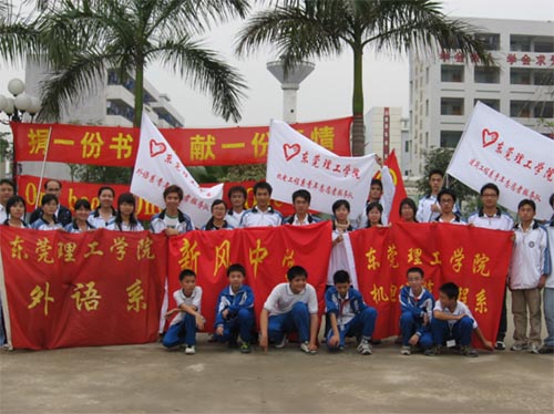 当天下午,外语系、机电(建筑)工程系的志愿者一早就来到新风中学布置现场,新风中学的学生在其团委老师的指挥带领下有序地排队把自己心爱的书无私地奉献给山区的孩子。志愿者们认真地在现场接收中学生的书籍,并分类装好。本次活动共收到各类书籍4234本,并吸引了大岭山电视台全程拍摄。
