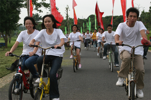 在激情洋溢的音乐声中,插着锦旗的自行车队浩浩荡荡地向松山湖出发了。他们脸带微笑,活力招展,展现了当代大学生热爱运动,挥洒青春的激情。