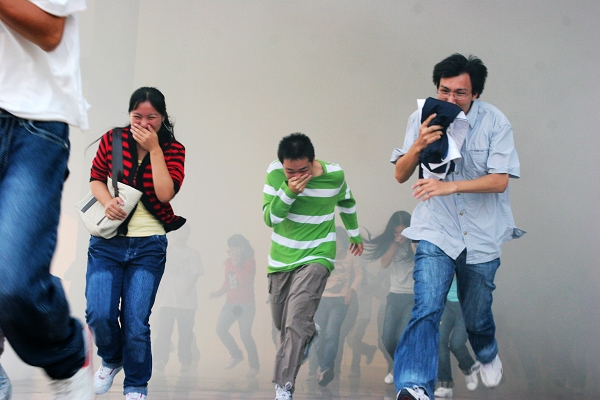 捂着鼻子,迅即离开火场,这是在演习中学习到火场生存技能
