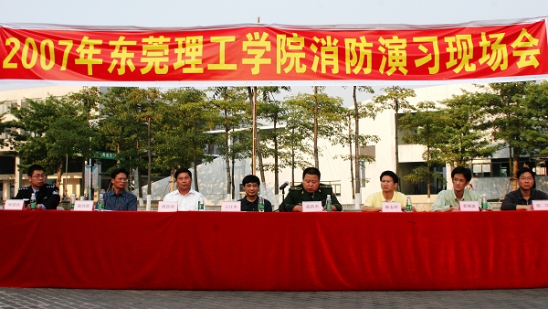 学院领导周致纳、王江水、戴炳源,松山湖消防大队、松山湖公安分局、松山湖安监分局等相关领导观看了演习,并在“消防安全 人人有责”的条幅上签名。