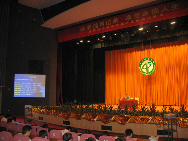 7月1日上午,我院2008届贷款毕业生离校教育在学院大礼堂举行。本次教育活动以“珍爱信用记录,享受幸福人生”为主题。中国人民银行东莞市中心支行调查统计科冯炎副科长以及中国工商银行东莞市分行国家助学贷款经办负责人出席了本次活动。