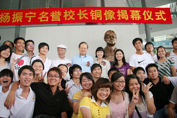 铜像揭幕后,在场学生争相与杨振宁博士在铜像前合影。