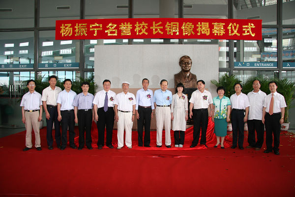 昨日下午4时30分,在300多名师生代表的欢迎下,杨振宁伉俪,老领导郑锦滔,东莞市副市长吴道闻,我校党委书记周致纳、校长杨晓西,虎门镇镇委副书记、镇长任洪杰,中国著名雕塑家、广州美术学院终身教授潘鹤,中国科学院高能物理研究所研究员、博士生导师马中骐,韦杰博士,在图书馆门前共同为杨振宁博士铜像揭幕。