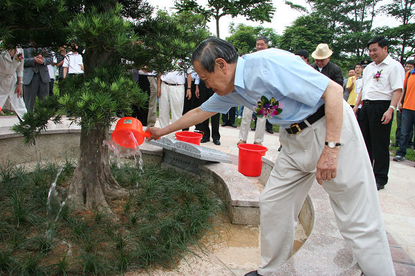 昨日下午5时许,杨振宁博士伉俪在市老领导郑锦滔,我校周致纳书记和杨晓西校长等的陪同下,来到院士林浇灌去年亲植的罗汉松。 一来到罗汉松前,周致纳书记向杨振宁讲述罗汉松的近一年来的生长状况。在微风的吹动下,罗汉松翠绿的枝叶轻轻地摆动着,仿佛欢迎主人的到来。随后,杨振宁伉俪一起浇灌了罗汉松,两人还不约而同地抬头仰望罗汉松,场面很是温馨。 在5月17日下午,杨振宁博士在学校发展情况汇报片里看到长势旺盛的罗汉松时,也忍不住低声说:“这棵树生长得很好!”