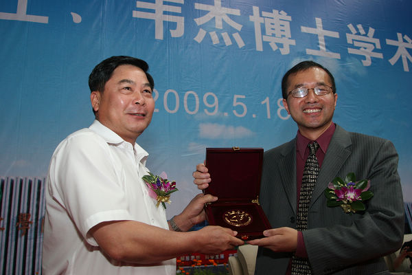 最后,周致纳书记代表学校向杨振宁博士和韦杰博士赠送了纪念品。会场热烈的掌声再次响起。