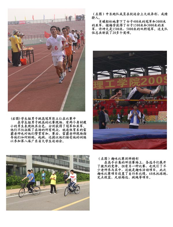经过两天激烈的角逐,11月28日下午3:30,我校2009年田径运动会拉下帷幕。周致纳、杨晓西、王江水、黄碧莲、邹晓平、戴炳源等校领导,教务长林养素以及学校中层干部出席了校运会闭幕式。