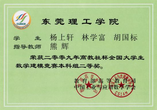 2009年,我校共招收17名本科生参加培训,在暑假两个月的时间里,熊辉博士与参加培训的学生每天坚持教学,并有规律地组织学生在松山湖活动,以交流专业问题。经熊辉博士的培训筛选后,成员有所调整,最终组成五支队伍参赛,经过老师和同学们的努力,在建模竞赛中共获得国家二等奖一项、广东省一等奖一项、广东省三等奖两项,又一次为我校赢得荣誉。