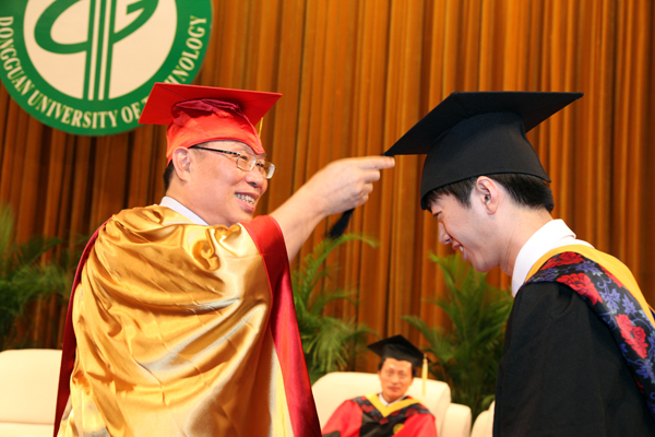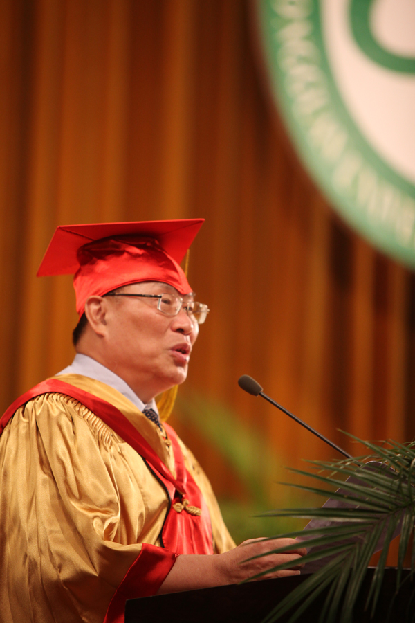 毕业典礼上,校党委书记周致纳向毕业生代表颁发了毕业证书,并与杨晓西一起为获得学士学位的毕业生代表一一扶正流苏。