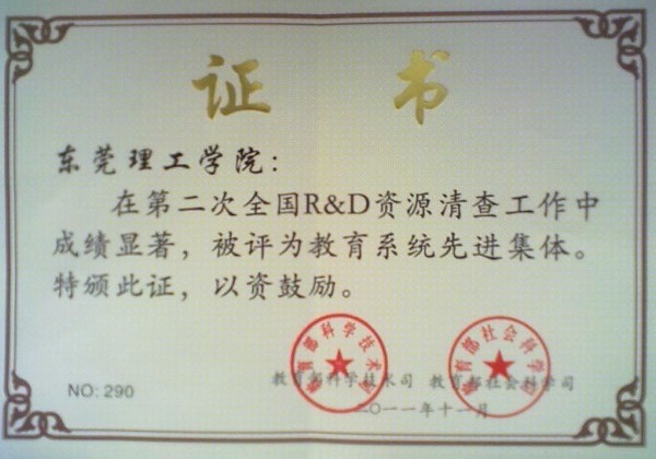 在第二次全国R&D资源清查工作中,我校开拓思路,创新方法,出色完成任务,被教育部评为教育系统“先进集体”,全国共有370个高校荣获此荣誉。此外,我校科研处刘晓蔚获得“先进个人”称号。