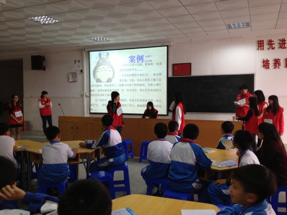 这次法制教育课堂以“未成年人保护法”和“预防未成年人犯罪法”为主题,具体内容涉及拐骗儿童、招用童工、沉迷网络、吸食毒品等与小学生密切相关的话题。课堂内容分为三个环节,开场先做主题介绍,接着由队员进行案例表演,进而由讲师对表演案例中涉及的与小学生密切相关的法律知识进行详细的解答。