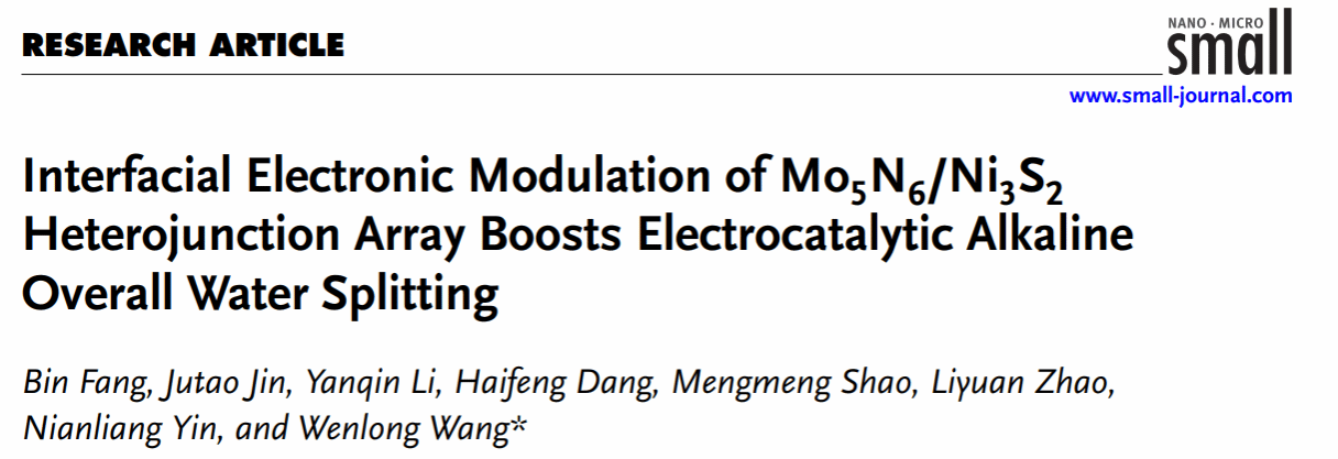 近期,我校汪文龙研究员团队在电解水制氢催化剂领域取得研究进展,相关成果以“Interfacial Electronic Modulation of Mo5N6/Ni3S2 Heterojunction Array Boosts Electrocatalytic Alkaline Overall Water Splitting”为题发表在材料学领域TOP期刊《Small》。该论文以九九精品视频一区在线久久久久久久久久毛片精品美女|国产99久久久久久免费看|中文精品99久久国产|国产69精品久久久久9999|精品久久久久久中文字幕无码|亚洲熟妇无码久久精品国产精品99|精品国产天堂综合一区在线为第一单位,博士后方彬是该论文的第一作者,汪文龙研究员为通讯作者。